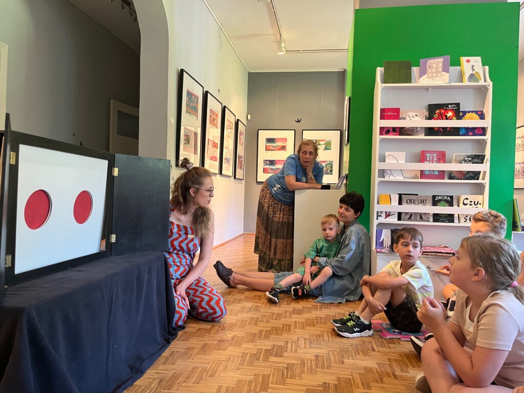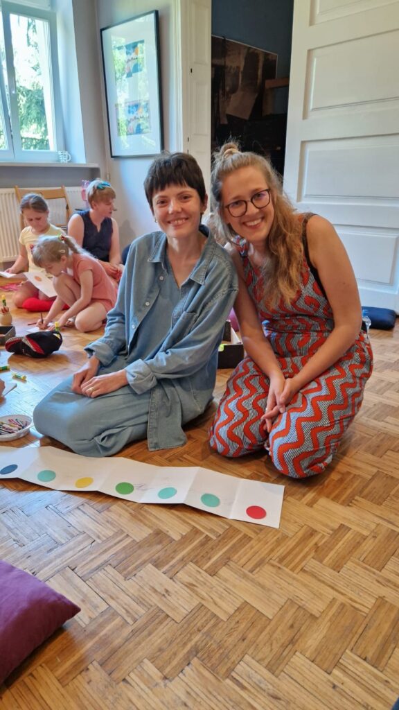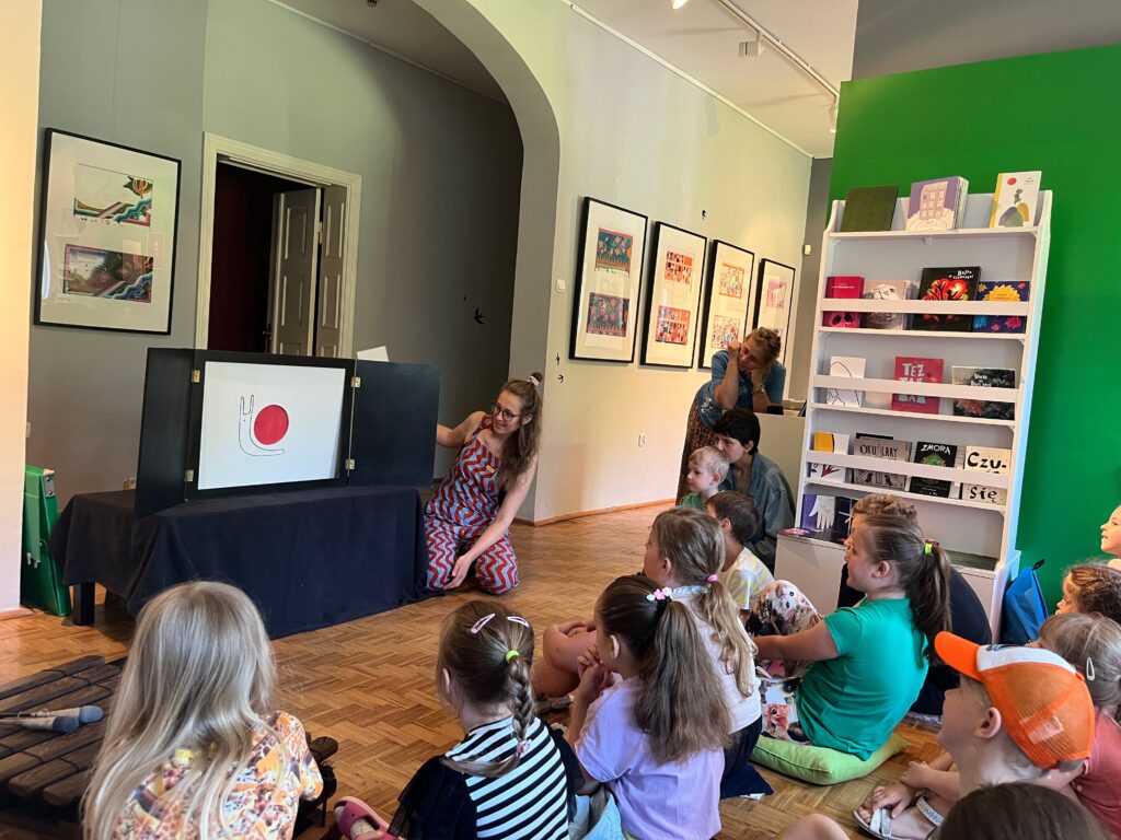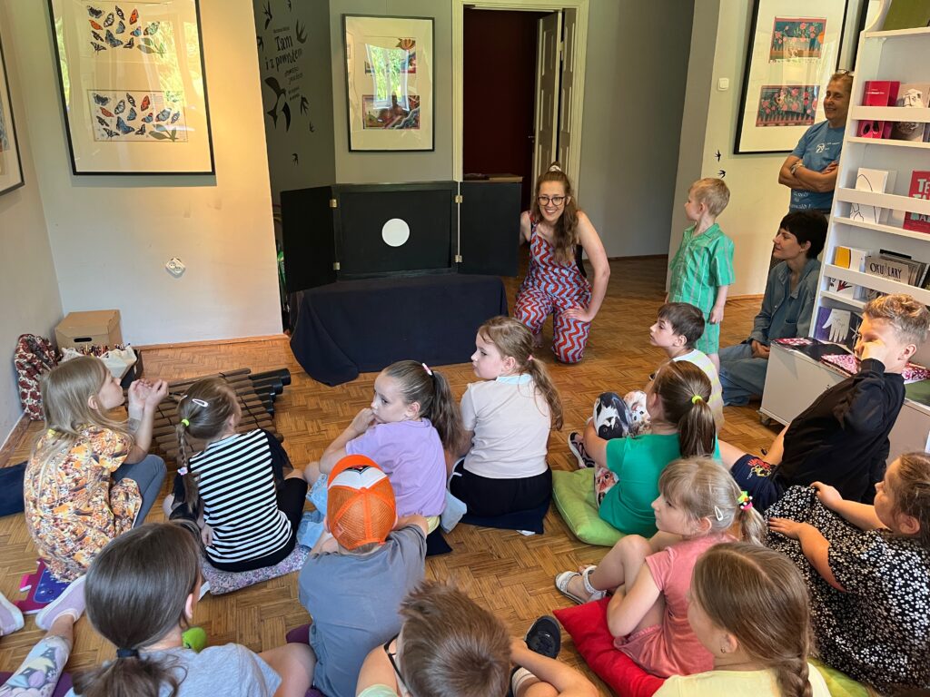 Następnego dnia w Slupcy spotkałyśmy się z grupą dzieci na spektaklu i warsztatach w Muzeum. Było kolorowo i wesoło, przenieśliśmy się do dalekiej Japonii, rozmawialiśmy o tym czym różni się ten odległy kraj od naszego. Na koniec odbył się kółeczkowy warsztat plastyczny.