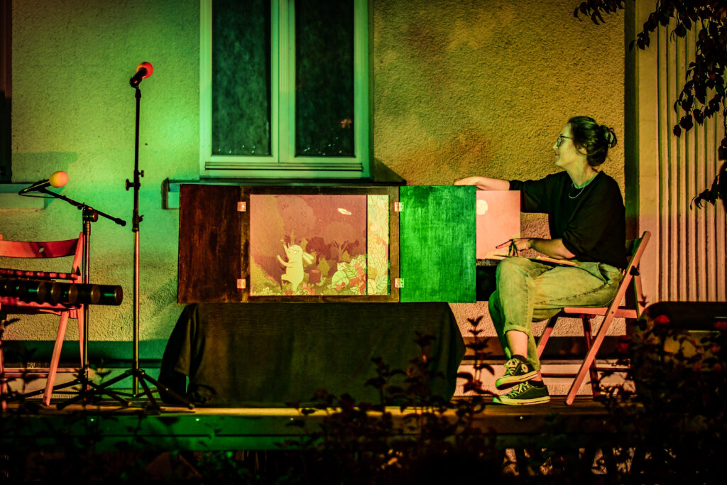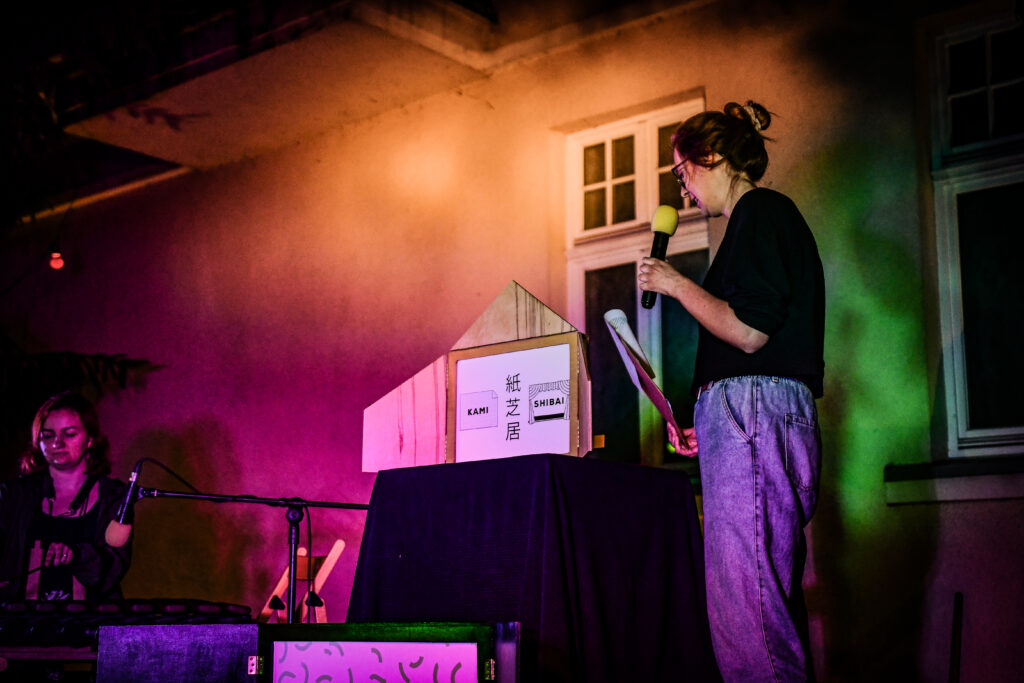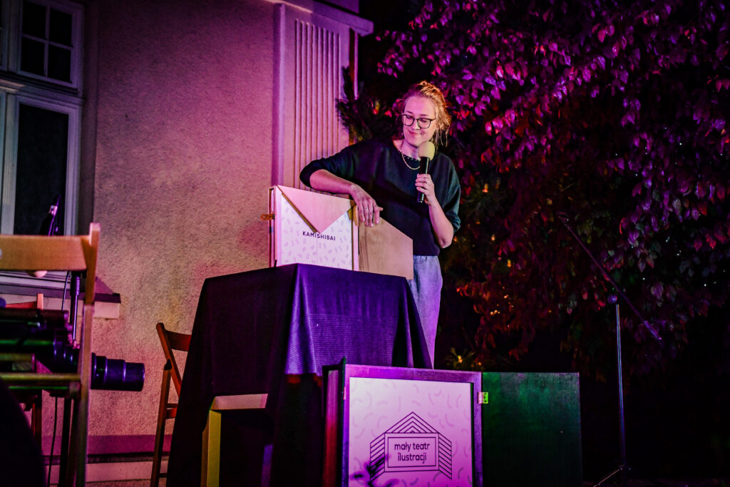 Spotkanie rozpoczęłyśmy od opowieści o historii teatru kamishibai, by następnie zaprosić widzów na spektakl pt. „Księżyc” zilustrowany przez Dobrusia Rafalska Ilustracje. Był to wyjątkowy pokaz, ponieważ z głośników popłynęło Księżycowe słuchowisko stworzone przez Projekt muzyka specjalnie na potrzeby naszego teatru, a na koniec Monika wykonała na żywo piosenkę ze słuchowiska! ![]()